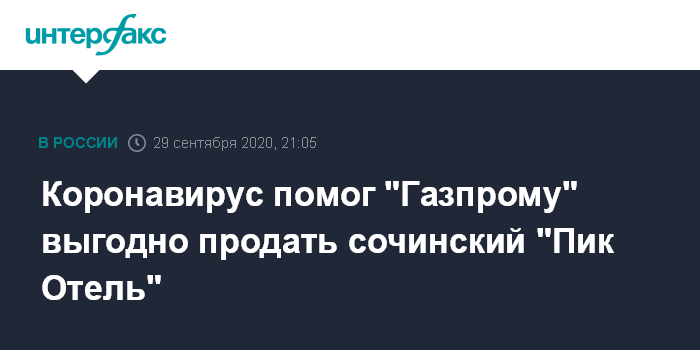 Москва. 29 сентября. INTERFAX.RU - Закрытие границ из-за пандемии коронавируса и обращение российских туристов к российским курортам помогло "Газпрому" выгодно продать непрофильный актив - "Пик Отель" в Красной поляне, реализацией которого монополия занималась с 2017 года.