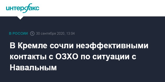 Москва. 30 сентября. INTERFAX.RU - В Кремле считают неудовлетворительным уровень взаимодействия с ОЗХО по ситуации с российским оппозиционером Алексеем Навальным, заявил пресс-секретарь президента РФ Дмитрий Песков.