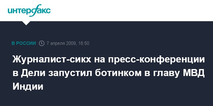 Москва. 7 апреля. INTERFAX.RU - Журналист-сикх на пресс-конференции с министром внутренних дел Индии Планьяппаном Чидамбарамом во вторник в Дели бросил в чиновника свою обувь, возмущенный ответом министра о волнениях в 1984 г., когда в Индии были убиты сотни сикхов, сообщает англоязычная арабская газета "Халидж таймс".