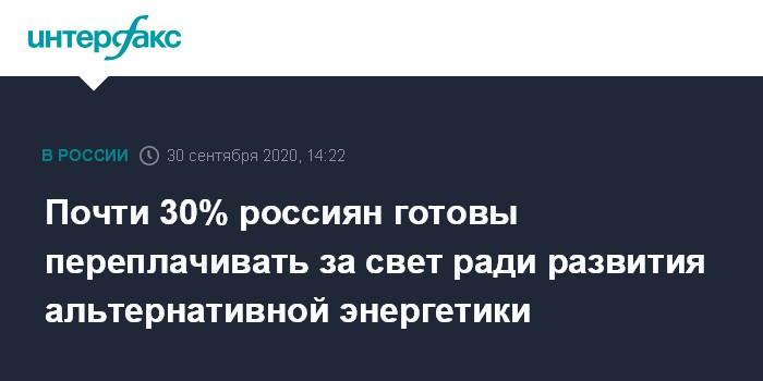 Москва. 30 сентября. INTERFAX.RU - Более четверти россиян (29%) согласились бы вносить большую плату за электроэнергию при уверенности, что вырученные средства будут использованы для внедрения альтернативных источников энергии или для повышения энергоэффективности объектов, свидетельствуют данные опроса ВЦИОМ.