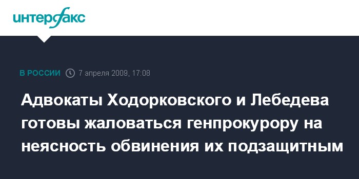 Москва. 7 апреля. INTERFAX.RU - Адвокаты экс-главы НК "ЮКОС" Михаила Ходорковского и бывшего главы МФО "МЕНАТЕП" Платона Лебедева намерены обратиться с жалобами на имя генпрокурора РФ в том случае, если обвинение бывшим руководителям компании не будет разъяснено.