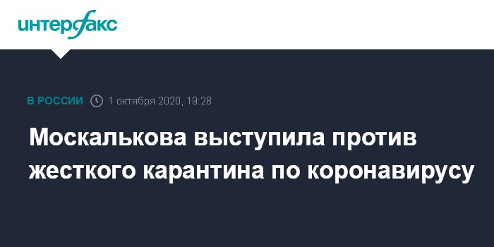 Москва. 1 октября. INTERFAX.RU - Уполномоченный по правам человека в России Татьяна Москалькова выступила за более мягкие меры для предотвращения распространения коронавируса.