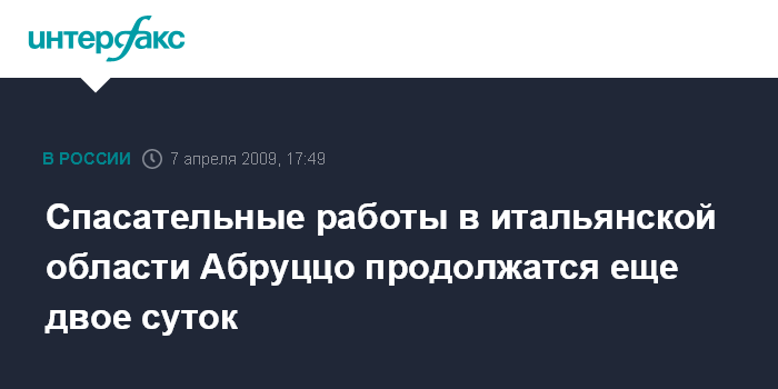 Москва. 7 апреля. INTERFAX.RU - Председатель Совета министров Италии Сильвио Берлускони пообещал во вторник, что спасательные работы в области Абруццо, пострадавшей от разрушительного землетрясения, продолжатся еще двое суток.