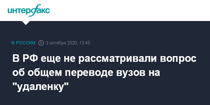 Москва. 3 октября. INTERFAX.RU - В Министерстве науки и высшего образования России пока не рассматривают вопрос об общем переводе вузов на дистанционный формат обучения, сообщили журналистам в субботу в пресс-службе ведомства.