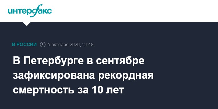 Москва. 5 октября. INTERFAX.RU - В сентябре в Санкт-Петербурге было зарегистрировано 5 739 смертей, следует из данных на сайте городского комитета по делам записи актов гражданского состояния.