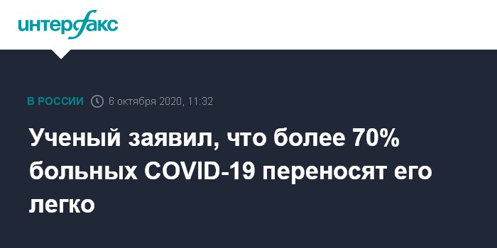 Москва. 6 октября. INTERFAX.RU - Подавляющее большинство больных COVID-19 переносят вирус в легкой форме, только 5% оказываются в тяжелом или критическом состоянии, сообщил главный инфекционист Минздрава РФ, профессор Сеченовского университета Владимир Чуланов.