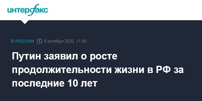 Москва. 6 октября. INTERFAX.RU - Уровень средней продолжительности жизни в России за последние 10 лет увеличился на 4,5 года, заявил президент РФ Владимир Путин.