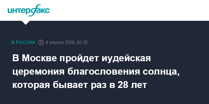 Москва. 8 апреля. ИНТЕРФАКС - В Московском еврейском общинном центре рано утром в среду состоится торжественная церемония "благословения солнца". Подобная ритуальная встреча восхода солнца происходит у иудеев один раз в 28 лет, сообщили корреспонденту "Интерфакс-Религия" (www.interfax-religion.ru) в Федерации еврейских общин России.