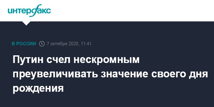 "Это мой день рождения, не национальный праздник, поэтому мне кажется, что преувеличивать значение этого события нескромно", - сказал Путин в интервью программе "Москва. Кремль. Путин" на "России 24" в среду.