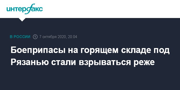 Москва. 7 октября. INTERFAX.RU - Интенсивность взрывов боеприпасов на горящем под Рязанской областью арсенале Западного военного округа снижается, сообщили в среду в Минобороны РФ со ссылкой на доклад с места событий.