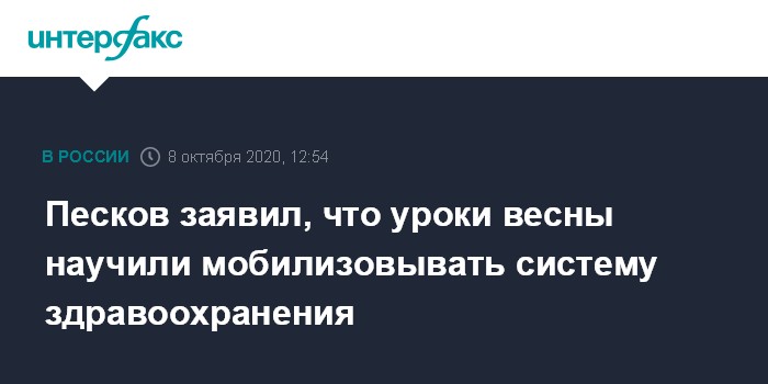 Москва. 8 октября. INTERFAX.RU - Из уроков весны 2020 года в России были сделаны выводы и к осени была мобилизована и переналажена под COVID-19 система здравоохранения, что позволяет более уверенно действовать на фоне растущей угрозы, заявил пресс-секретарь президента Дмитрий Песков.