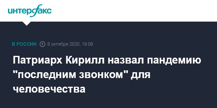 Москва. 8 октября. INTERFAX.RU - Патриарх Московский и всея Руси Кирилл считает, что пандемия коронавируса может быть последним предупреждением бога человечеству, которое сбилось с пути.