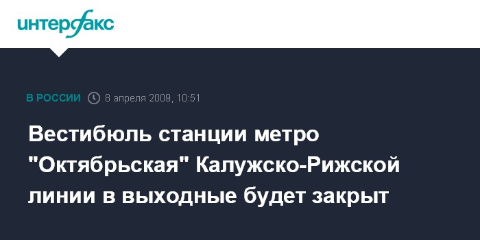 Москва. 8 апреля. INTERFAX.RU - В связи с выполнением работ по ремонту эскалаторов в субботу и воскресенье, 11 и 12 апреля, вестибюль станции метро "Октябрьская" Калужско-Рижской линии будет закрыт, сообщили "Интерфаксу" в среду в пресс-службе столичной подземки.