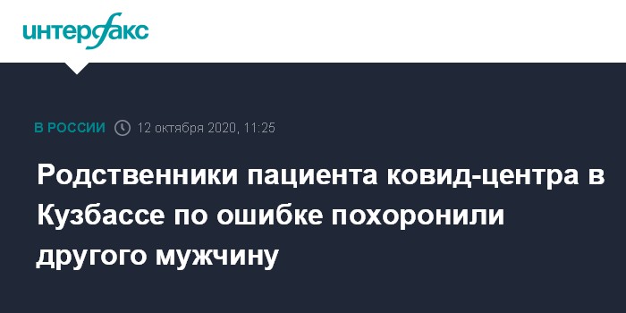 Москва. 12 октября. INTERFAX.RU - Минздрав Кузбасса начал проверку оказания помощи двум пациентам коронавирусного центра, один из которых скончался и был выдан не тем родственникам.