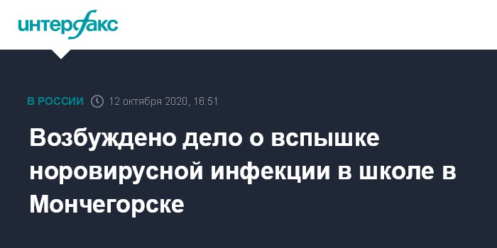 Москва. 12 октября. INTERFAX.RU - В Мончегорске возбуждено уголовное дело по факту заражения не менее 53 человек в одной из школ норовирусной инфекцией, сообщили в СК Мурманской области. Вспышка заболеваемости произошла в школе в сентябре. Пострадали в том числе дети. Всех лечили амбулаторно.