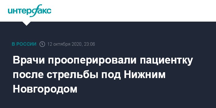 Москва. 12 октября. INTERFAX.RU - Медики провели операцию женщине, получившей тяжелые ранения в результате стрельбы в деревне в Нижегородской области, сообщил министр здравоохранения региона Давид Мелик-Гусейнов в фейсбуке.