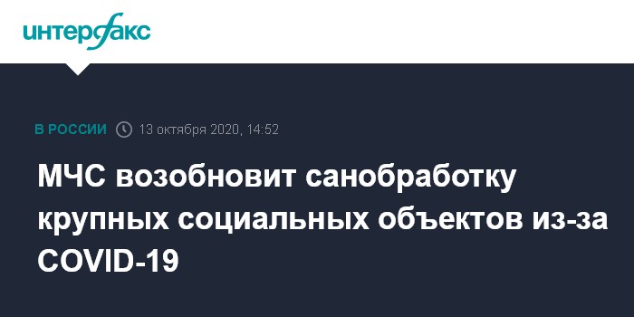 Москва. 13 октября. INTERFAX.RU - МЧС России возобновляет масштабные работы по санитарной обработке социально значимых объектов и объектов транспортной инфраструктуры по всей стране в связи с ростом числа заболевших коронавирусом, сообщили журналистам во вторник в пресс-службе министерстве.
