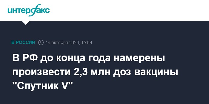 Москва. 14 октября. INTERFAX.RU - В России до конца года планируется произвести 2,3 млн доз вакцины от коронавирусной инфекции "Спутник V" института имени Гамалеи, а весной выйти на объемы в 15 млн доз в месяц, сообщил глава Минпромторга Денис Мантуров.