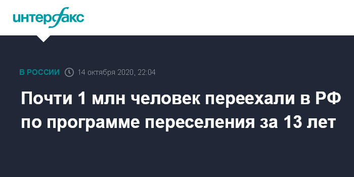 Москва. 14 октября. INTERFAX.RU - Около 960 тыс. человек переехали в Россию в рамках программы переселения соотечественников из-за рубежа с 2007 года, заявила в среду начальник Главного управления по вопросам миграции МВД России Валентина Казакова.
