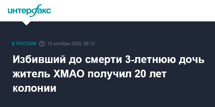Москва. 15 октября. INTERFAX.RU - Суд Ханты-Мансийского автономного округа приговорил к 20 годам колонии строгого режима жителя Нефтеюганска за избиение и убийство трехлетней дочери, сообщает прокуратура округа в четверг.