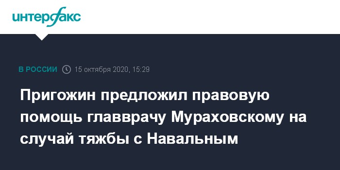 Москва. 15 октября. INTERFAX.RU - Глава попечительского совета медиа-группы "Патриот" Евгений Пригожин предложил главврачу омской больницы скорой помощи Александру Мураховскому безвозмездную правовую помощь, если коллектив медучреждения захочет судиться с Алексеем Навальным из-за клеветы.