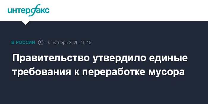 Москва. 16 октября. INTERFAX.RU - В России с 1 января 2021 года введут единые требования к работе мусороперерабатывающих заводов и полигонов. Как сообщила пресс-служба правительства, такое постановление подписал премьер Михаил Мишустин.