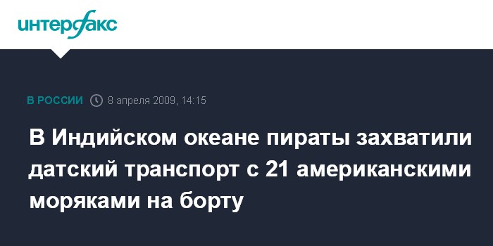 Москва. 8 апреля. INTERFAX.RU - Сомалийские пираты в среду захватили датский сухогруз, управляемый одним из пароходств США. На борту судна находится экипаж из 21 человека, все они граждане США, сообщает британская телекомпания "Скай-ньюс".