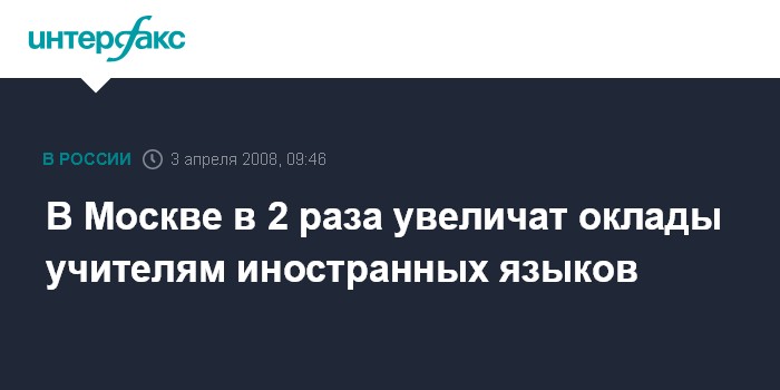 Москва. 3 апреля. INTERFAX.RU - Преподаватели иностранных языков московских школ будут получать доплату в размере 100% к ставке единой тарифной сетки с учетом учебной нагрузки, сообщили "Интерфаксу" в городской администрации в четверг.