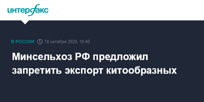 Москва. 16 октября. INTERFAX.RU - Минсельхоз предлагает запретить в РФ промышленный вылов китообразных и их экспорт за пределы страны, следует из законопроекта, размещенного на сайте regulation.gov.ru.