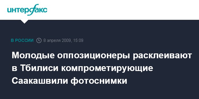 Москва. 8 апреля. INTERFAX.RU - Несколько десятков членов молодежных организаций оппозиционных партий в среду обклеили стены зданий, прилегающих к станции метрополитена "Свобода" на центральном проспекте Руставели снимками президента Михаила Саакашвили, компрометирующими его. На снимках, сделанных в августе прошлого года, - Михаил Саакашвили, жующий свой галстук и прячущийся на земле за телами охранников в Гори.