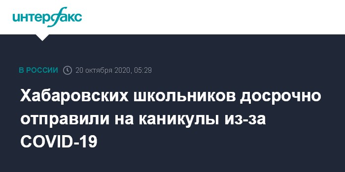 По сообщению ведомства, с 21 октября до 9 ноября на каникулы уходят школьники Хабаровского края, кроме северных районов региона, где нет зарегистрированных случаев коронавируса. Также со среды, 21 октября, вузы и ссузы края на один месяц переходят на дистанционный режим обучения.