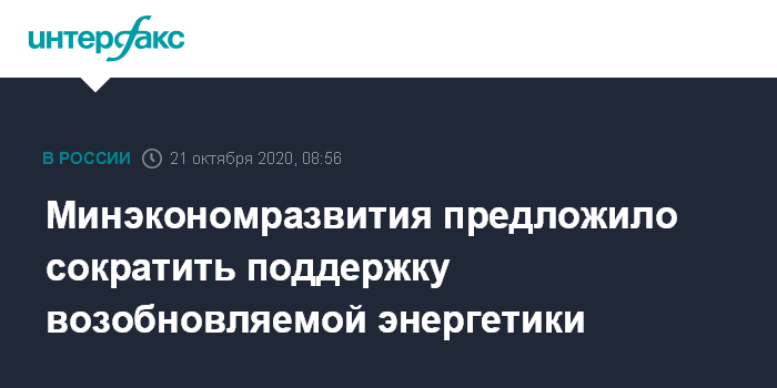 Москва. 21 октября. INTERFAX.RU - Минэкономразвития обдумывает возможность сократить программу поддержки генерации на основе возобновляемых источников энергии (ВИЭ) с 400 до 200 млрд рублей. Как пишет "Коммерсантъ", об этом говорится в отзыве министерства на предложения Минэнерго по отбору проектов по новой программе.