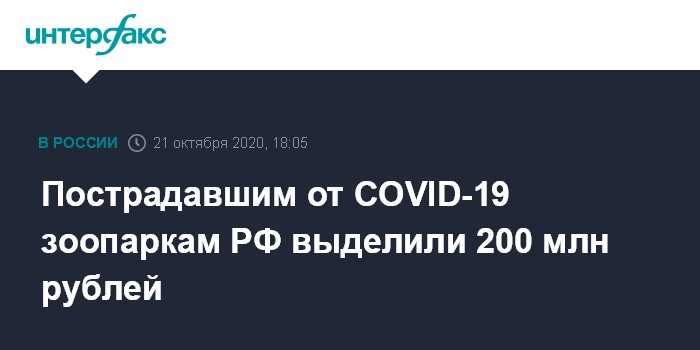 Москва. 21 октября. INTERFAX.RU - На поддержку зоопарков, которые пострадали из-за закрытия во время пандемии коронавируса, выделено 200 млн рублей, сообщил замминистра культуры РФ Сергей Обрывалин.