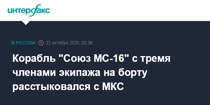 Москва. 22 октября. INTERFAX.RU - Пилотируемый корабль "Союз МС-16" с российскими космонавтами Анатолием Иванишиным, Иваном Вагнером и астронавтом NASA Кристофером Кэссиди на борту расстыковался с Международной космической станцией (МКС) перед посадкой на Землю.