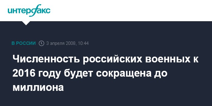 "К этому сроку ВС должны составить миллион военнослужащих", - заявил А.Сердюков в интервью газете "Комсомольская правда", публикуемом в четверг.
