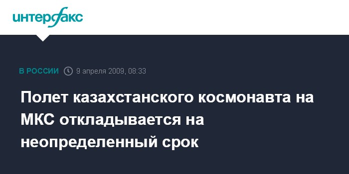 Москва. 9 апреля. INTERFAX.RU - Полет казахстанского космонавта в составе международного экипажа на Международную космическую станцию (МКС), планировавшийся на сентябрь текущего года, откладывается на неопределенное время из-за сокращения финансирования, сообщил глава национального космического агентства Казахстана (Казкосмос) Талгат Мусабаев.