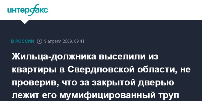 Москва. 9 апреля. INTERFAX.RU - Качканарский межрайонный следственный отдел СУ СКП РФ по Свердловской области провел проверку по факту обнаружения в квартире одного из домов в городе Нижняя Тура мумифицированного трупа мужчины, который, как выяснилось, решением суда был выселен из квартиры.