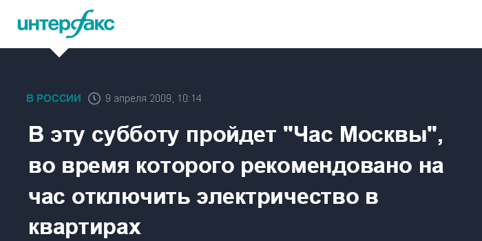 "В 2009 г. Москва присоединилась к этой акции, а также к властям обратились школьники города с просьбой провести свой "Час Москвы", - рассказал собеседник агентства. По его словам, желающие принять участие в акции должны 11 апреля с 20:30 до 21:30 отказаться от использования электричества у себя дома.