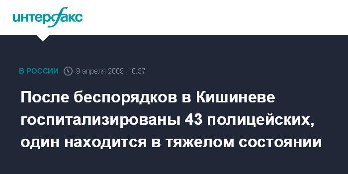 Москва. 9 апреля. INTERFAX.RU - Медицинская помощь понадобилась 118 полицейским, пострадавшим при беспорядках в Молдавии, 43 сотрудника правоохранительных органах госпитализированы.