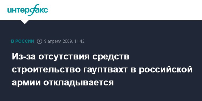 Москва. 9 апреля. INTERFAX.RU - Строительство и реконструкция 142 гарнизонных гауптвахт российской армии откладывается из-за отсутствия финансовых средств, сообщил "Интерфаксу-АВН" в четверг источник в российском военном ведомстве.