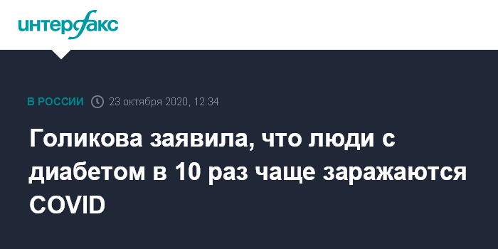 Москва. 23 октября. INTERFAX.RU - Больные сахарным диабетом заражаются COVID-19 в 10,3 раза чаще остальных и подвержены более высокому риску летального исхода, сообщила вице-премьер Татьяна Голикова.