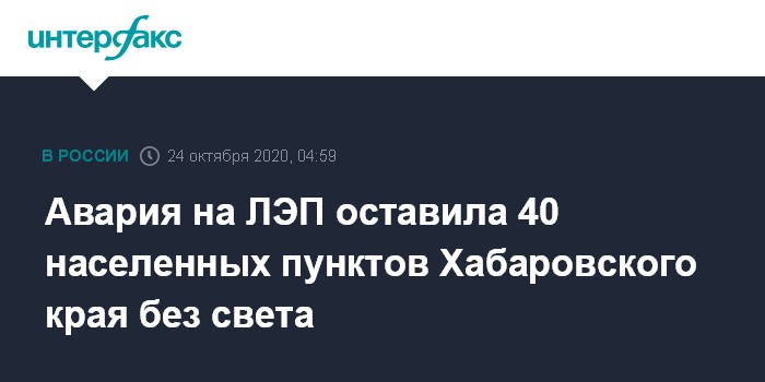 Москва. 24 октября. INTERFAX.RU - Из-за пришедшего в Хабаровский край циклона со снегом и сильным ветром произошли аварии на электросетях, в результате чего частично обесточены 40 населенных пунктов, в которых проживают более 36 тыс. человек, сообщается на сайте Минэнерго РФ в субботу.