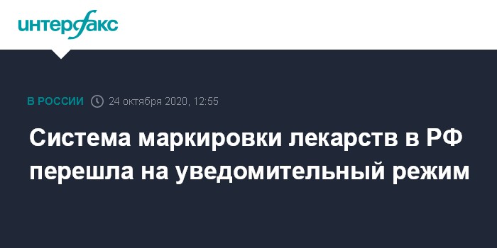 Москва. 24 октября. INTERFAX.RU - В России система маркировки лекарств будет временно переведена в уведомительный режим, что позволит аптекам продавать их без задержек, сообщил глава Минпромторга Денис Мантуров.