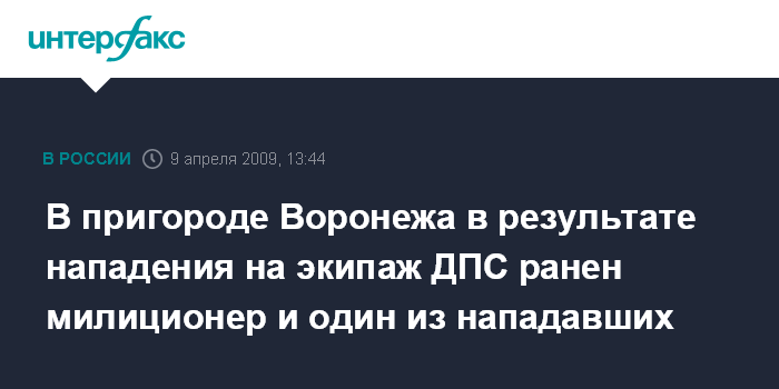 Москва. 9 апреля. INTERFAX.RU - В пригороде Воронежа в ночь на четверг на экипаж ДПС ОВД Железнодорожного района было совершено нападение, получили ранения милиционер и один из нападавших, сообщили "Интерфаксу" в УГИБДД региона.