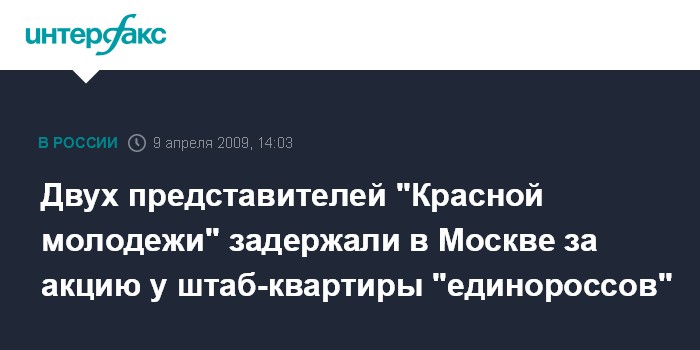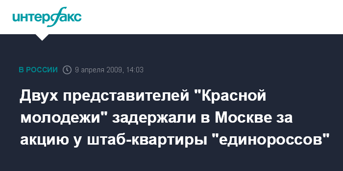 Москва. 9 апреля. INTERFAX.RU - В Центральном округе столицы задержаны два представителя общественно-политического движения "Красная молодежь", приковавшие себя наручниками к ограде возле штаб-квартиры московского городского отделения "Единой России", сообщили "Интерфаксу" в управлении информации и общественных связей ГУВД столицы.