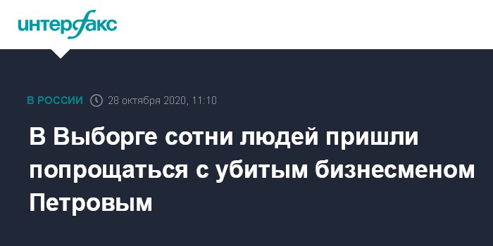 Москва. 28 октября. INTERFAX.RU - Несколько сотен человек пришли на церемонию прощания с убитым депутатом Выборгского городского совета, бизнесменом Александром Петровым, передал корреспондент "Интерфакса" в среду.