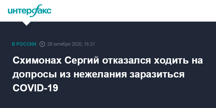 Москва. 28 октября. INTERFAX.RU - Отлученный от церкви схимонах Сергий Романов не хочет ходить на допросы по уголовным делам в Следственный комитет, поскольку следователи заражаются коронавирусом, а он опасается заразиться от них, заявил в видеообращении на YouTube его соратник Всеволод Могучев.