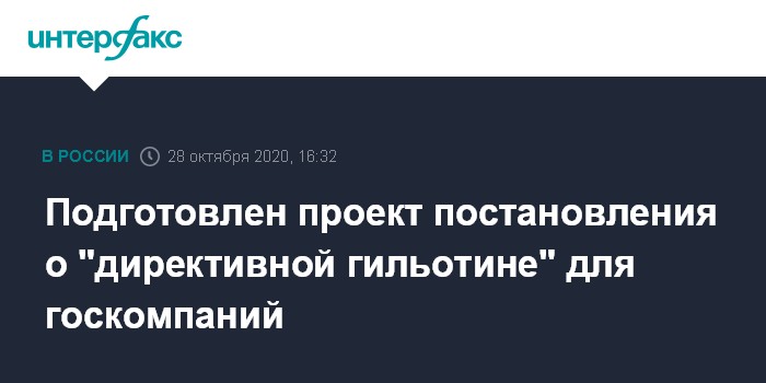 Минфин, который недавно получил кураторство над Росимуществом и, соответственно, вопросами управления госсобственностью, выдвинул предложение реализовать в госкомпаниях механизм "директивной гильотины" весной этого года в рамках подготовки общенационального плана восстановления экономики. Суть идеи - снятие с контроля исполненных и утративших актуальность директив для госкомпаний или их изменение с учетом влияния на деятельности АО.