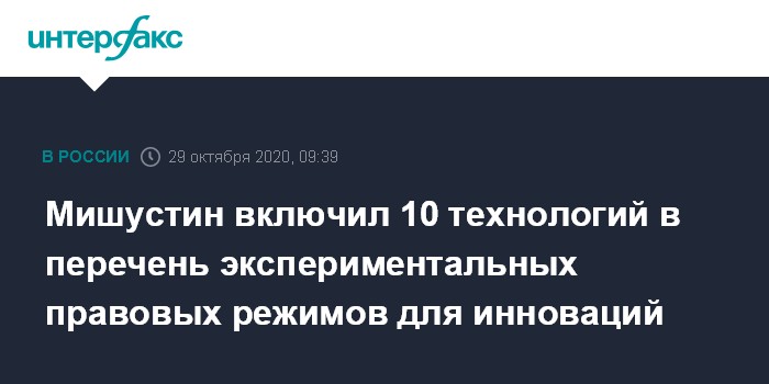 Москва. 29 октября. INTERFAX.RU - Премьер-министр Михаил Мишустин утвердил перечень из десяти технологий для экспериментальных правовых режимов в сфере цифровых инноваций, сообщила пресс-служба правительства.