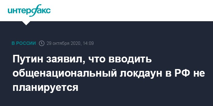 Москва. 29 октября. INTERFAX.RU - Общенациональный локдаун в России в связи с ситуацией вокруг коронавируса вводить не планируется, заявил президент РФ Владимир Путин.